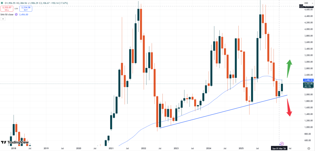 إيثيريوم (ETH) – يتم تداول الإيثيريوم حالياً عند 2,332 دولاراً. وقد تمكن السعر من كسر مستوى الدعم الأخير عند 2,000 دولار ويستمر في التحرك في مسار صاعد.