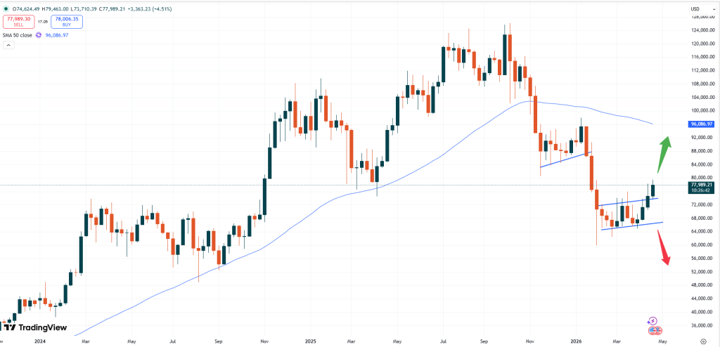 البيتكوين (BTC) – يتم تداول البيتكوين عند 77,989 دولاراً. وقد نجح السعر في الخروج من نطاق التداول العرضي الأخير، ليواصل صعوده منذ ذلك الحين. ومع ذلك، لا يزال الزخم الصعودي محدوداً نسبياً مع اقتراب السوق من مستوى مقاومة فنية؛ حيث إن منطقة 79,000 دولار الحالية كانت تمثل منطقة دعم في أبريل 2025، مما قد يشكل عائقاً أمام الارتفاع الحالي.