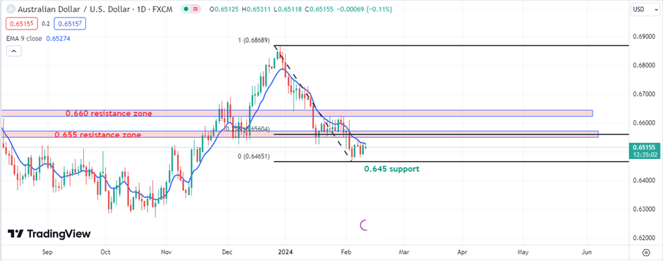If the AUD/USD pair manages to overcome the crucial resistance, it might lead to further ascent and the targets would be the 23.6% Fibonacci retracement level and then the significant psychological barrier at 0.6600.