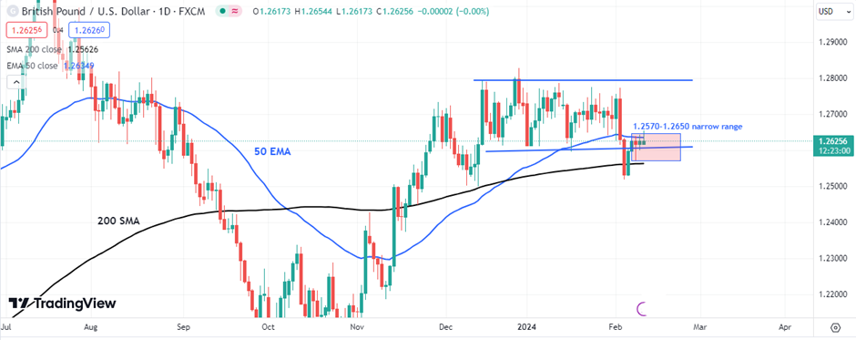 The GBP/USD pair has been trading in a narrow range between 1.2570 and 1.2650 for the last few sessions with decreased volatility as it approaches the key economic events. The 50-day EMA at about 1.2630 has provided a major obstacle for any bullish advances of the Pound Sterling.