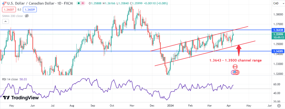 At present, the outlook suggests a continuation of this sideways movement of the ascending channel, specifically between the 1.3643 and 1.3500 levels. A successful breach above the 1.3643 resistance could catalyze the pair to target further gains, with an initial aim at the 1.3700 mark.