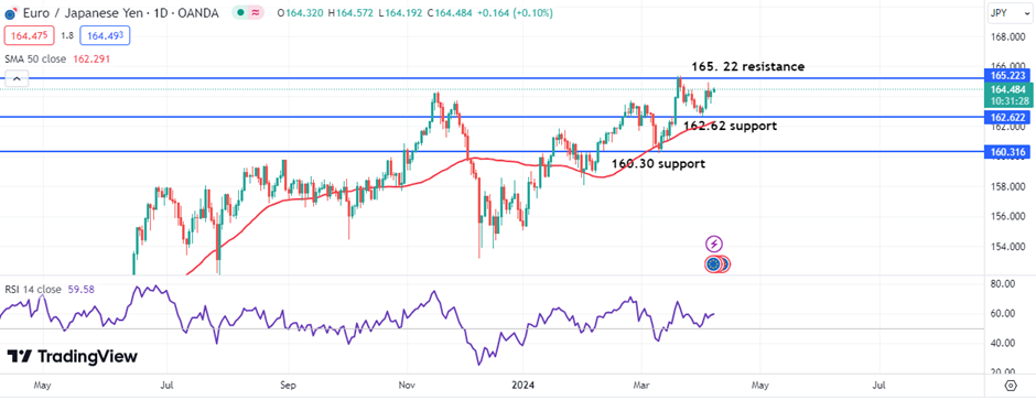 -The EURJPY pair is beneath the 165.22 resistance. Surpassing this could lead to targets of 167 – 168, while falling below the 162.62 support points towards further downside.