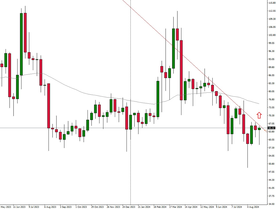 – BTC: Bitcoin is trading at USD 59,079. The market moved downwards again last week, after a possible upward breakout had previously emerged. However, the positive momentum did not last long and the market was once again defeated.