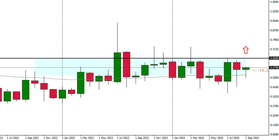 As the monthly chart indicates, an upward breakout must first take place and the important resistance zone at USD 0.6500 must be broken. Only then could an impulsive breakout to the upside materialize. However, it is currently positive that the market is able to continue within this zone without falling back.
