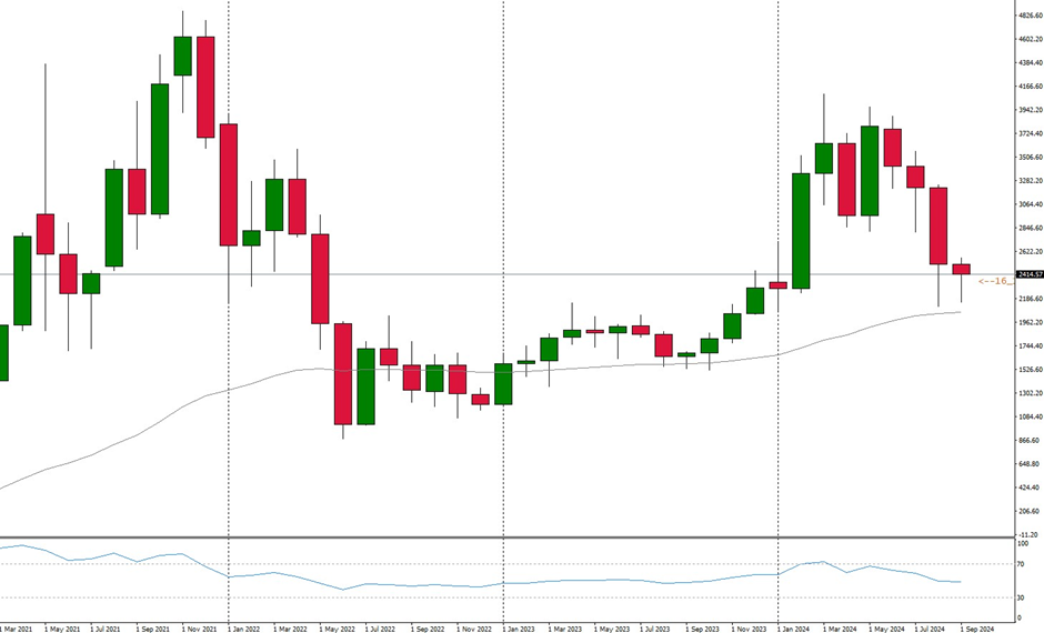 – ETH: Ethereum is trading at USD 2,417.00. ETH is often unable to perform so positively when market participants are active in Bitcoin. In this case, ETH also falls back slightly. On the monthly chart, however, it is still positive that the important 50- moving average is holding as a support zone. This could provide positive potential for the market in the short term.