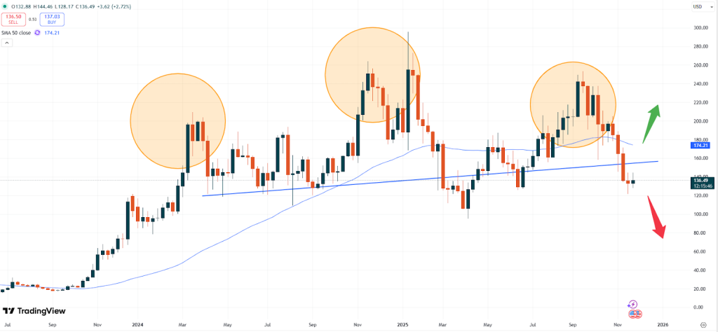 – SOL: Solana is currently trading at USD 136.52. Solana continues to remain under pressure as it has not been able to move to the upside. The price stopped falling but remains under the critical “neckline” in the head – and- shoulders pattern as the chart below shows.