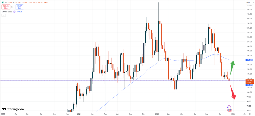 SOL – Solana is currently trading at USD 125.43. Also, Solana is trading on top of a psychological support level currently with the risk that this zone will break to the downside.