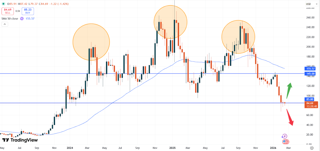 The crypto market in general remains in a negative pattern and no signs currently emerge, that it might start moving higher for now. With Bitcoin currently forming a triangle pattern, potentially leading to a breakout, market participants also focus on social media data. The words “Bitcoin to zero” have been searched for countless times in the US recently according to Google data and even hit an all- time- high. Yet, such moves have also peaked in the past. In particular between 2021 and 2022 the market then led to a bottom being able to rise from there. Currently, geopolitical tensions are flaring up as well. The tensions in regards to Iran and the news around US tariffs have added an array of negative headlines market still need to digest.