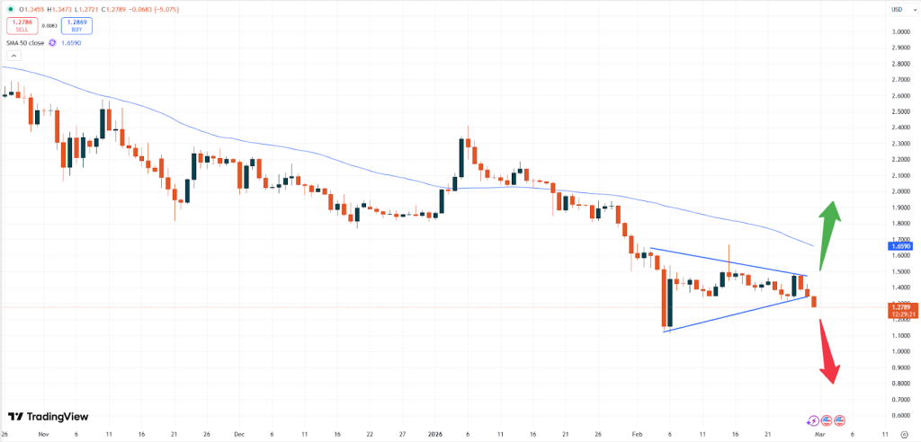 – XRP: XRP is currently trading at USD 1.2786. The price of XRP keeps fading and with that the odds of a rise in this market seem far as well. Due to the negative momentum in BTC altcoins tend to even fade more.