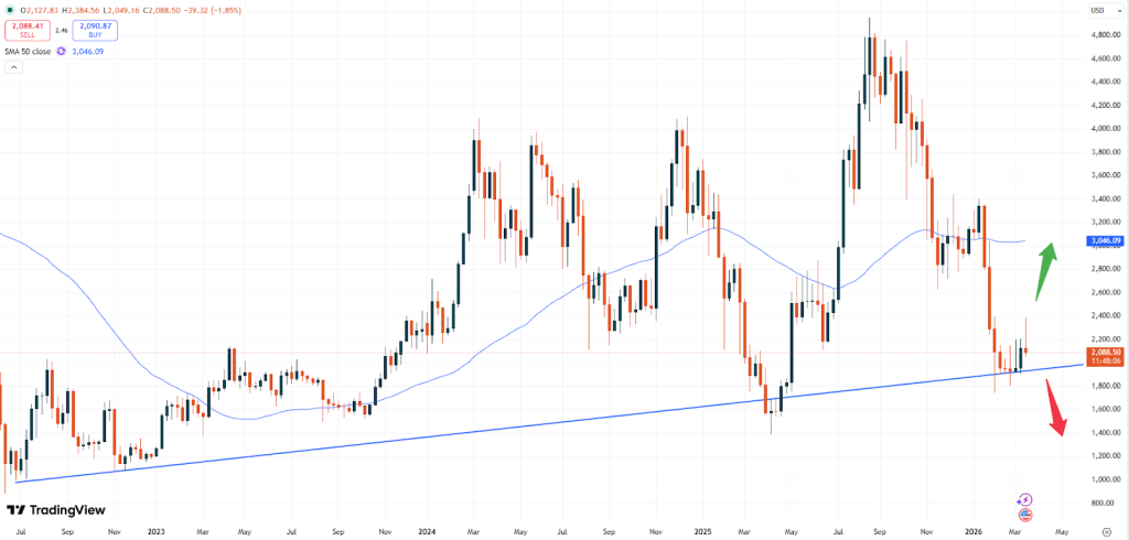 ETH – Ethereum is currently trading at USD 2,088. Also, Ethereum has been in a positive trend and continued moving higher in the recent three weeks. Yet, since profit taking mostly set in over the weekend, the upside momentum has been curbed pushing the market back to the sideways trading range again.
