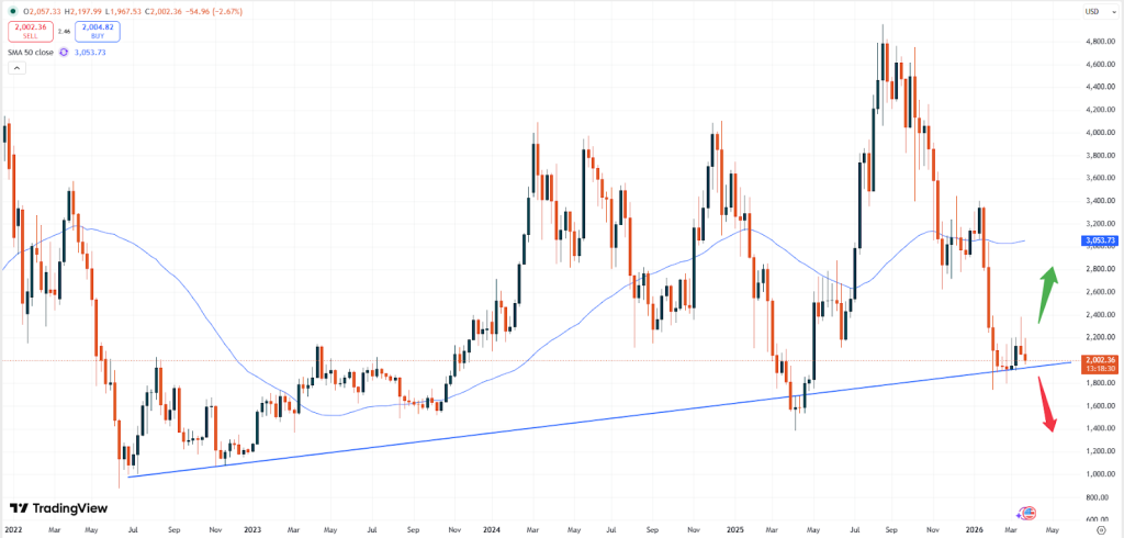 – ETH: Ethereum is currently trading at USD 2,002 just slightly above the major psychological round number of USD 2,000. A break below might hence offer significant downside momentum, based also on technical charting levels.
