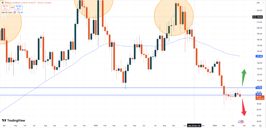 – SOL: Solana is currently trading at USD 82.31. The pressure of Solana below the USD 100.00 level has increased and traders seem to rather sell rallies within the downtrend.
