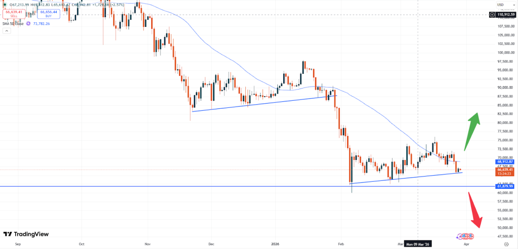 The daily chart above shows that the market failed to push above the 50- moving average zone, when touching this level. This has been the case throughout January this year and also seems to happen now as the chart shows. A break of the USD 65,000 zone might cause the market to weaken again and traders should follow this trend.