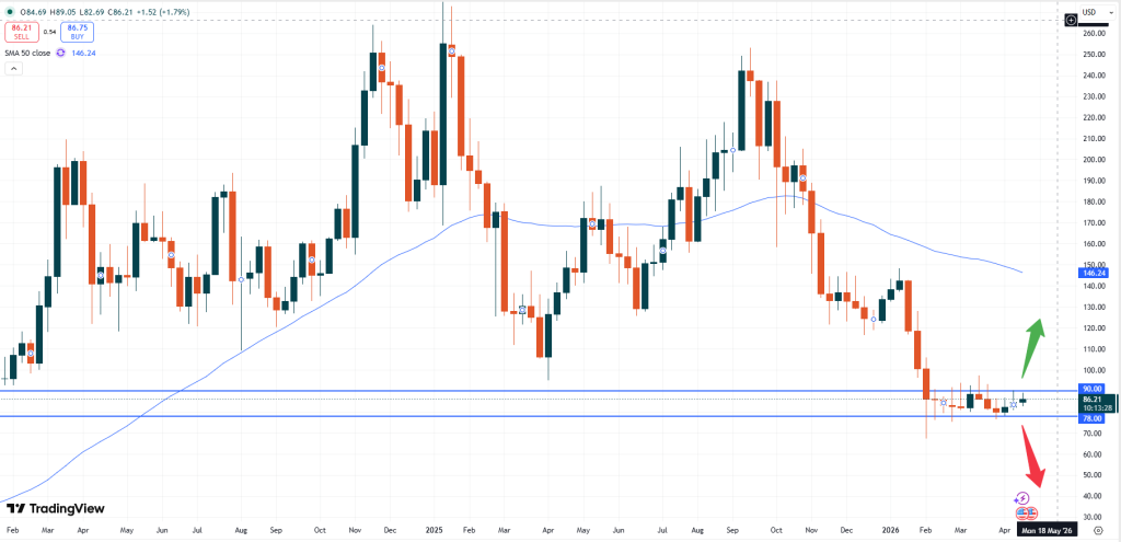 As the weekly chart above shows, the price needs to break above the USD 90.00 level initially, to offer another wave of positive momentum. Traders should hence also pay attention to the important support level at USD 78.00. A break below might cause the downtrend to continue again.
