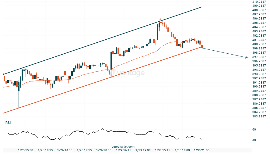 Esta configuración de trading en Meta está formada por un período de consolidación; un período en el que el precio se mueve principalmente de forma lateral antes de elegir una nueva dirección a largo plazo. Debido a la rotura bajista a través del nivel de soporte, parece sugerir que podríamos ver el próximo movimiento del precio hasta 397.6768.