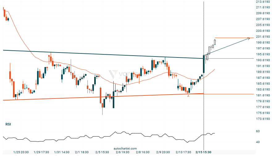 El Tesla ha atravesado la línea de resistencia de un patrón de gráfico técnico con un Hombro – cabeza – hombro invertido. Como le hemos visto retroceder desde esta posición en el pasado, deberíamos esperar la confirmación de la ruptura antes de actuar. Ha llegado a esta línea dos veces en los últimos 38 días y sugiere un posible nivel objetivo alrededor de 201.2348 dentro de las próximas 2 días.