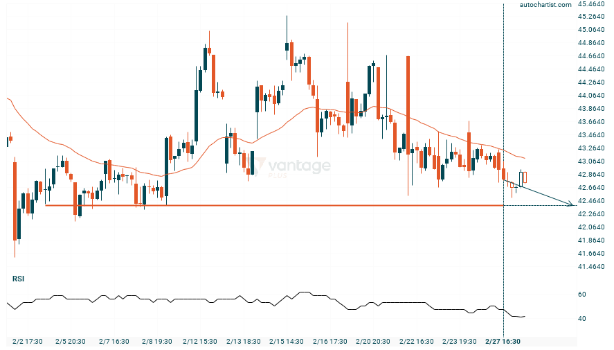 Intel se está acercando a una línea de soporte en 42.3950. Si llega a la línea de soporte, puede atravesar este nivel para continuar con la tendencia bajista, o puede girarse y volver a los niveles actuales.