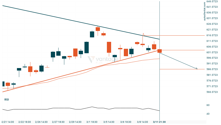 El patrón de Triángulo identificado en Netflix ha atravesado un nivel de soporte y el impulso del precio continúa moviéndose en dirección bajista. Continúa siendo una buena oportunidad de trading y se espera que el precio alcance 586.0813 en un plazo de 2.