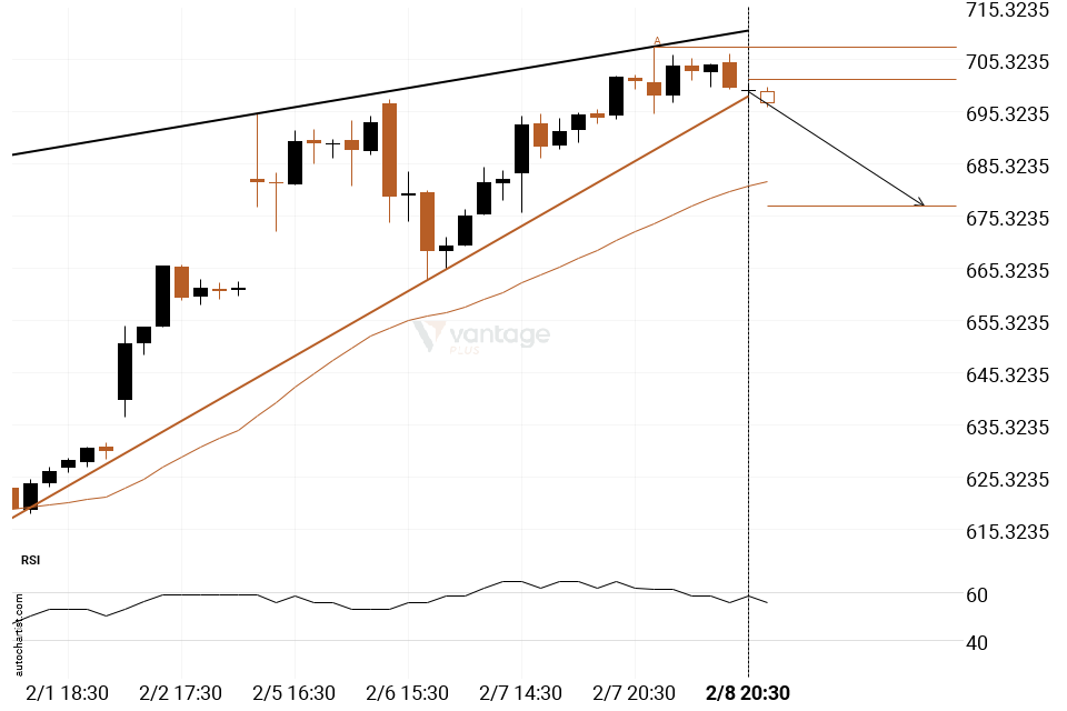 Nvidia has broken through a support line of a Rising Wedge chart pattern. If this breakout holds true, we may see the price of Nvidia testing 677.0990 within the next 11 hours. But don’t be so quick to trade, it has tested this line in the past, so you should confirm the breakout before taking any action.
