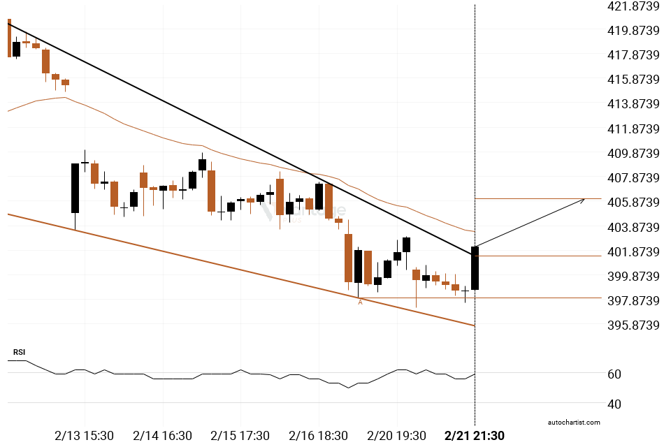 The breakout of Microsoft through the resistance line of a Falling Wedge could be a sign of the road ahead. If this breakout persists, we may see the price of Microsoft testing 406.0359 within the next 14 hours.