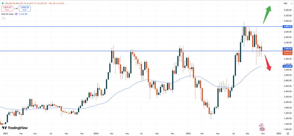 – ETH: Ethereum wird derzeit bei 3.879 USD gehandelt. Die jüngsten Kerzen auf Basis des Wochencharts zeigten lange Schatten nach unten. Dies könnte als positives Muster angesehen werden, wenn die Tiefststände bei 3.600 USD nicht nach unten durchbrochen werden.