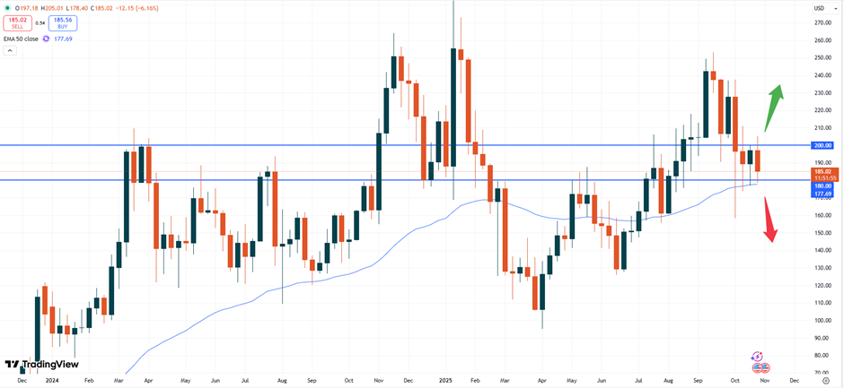 – SOL: Solana wird derzeit bei 185,02 USD gehandelt. Dieser Token bewegt sich weiterhin in einem kleinen Bereich zwischen 200,00 USD und 180,00 USD. Ein möglicher Ausbruch könnte eine starke Preisbewegung in beide Richtungen auslösen.