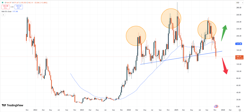 – SOL: Solana wird derzeit bei 142,05 USD gehandelt. Basierend auf dem technischen Kursverlauf dürfte sich der Markt weiter abschwächen.
