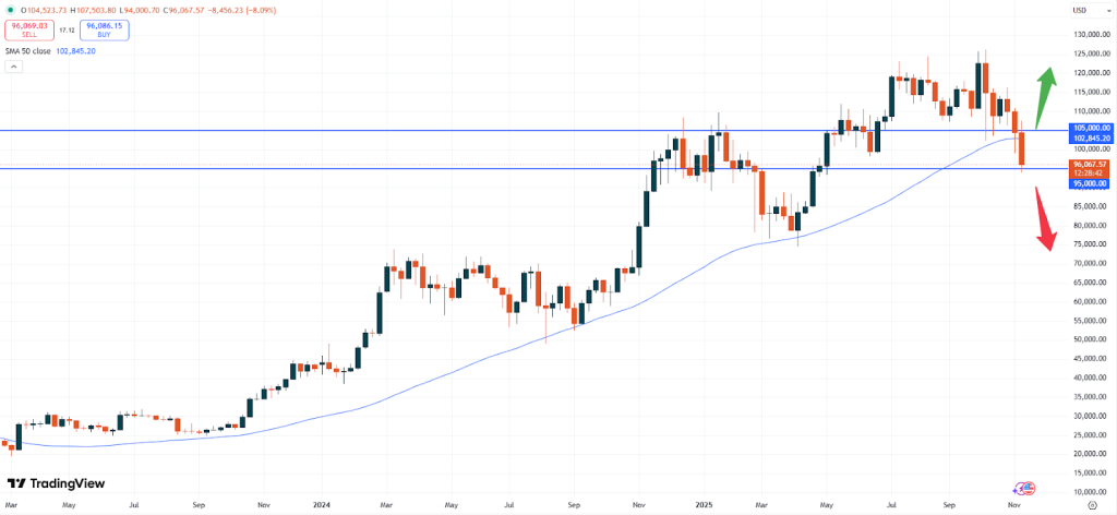 Der obige Wochenchart zeigt wichtige Trendlinien, die den zukünftigen Trend bestimmen könnten. Ein Durchbrechen der Marke von 95.000 USD könnte zu einer weiteren Schwächung von Bitcoin führen. Dies könnte BTC in Richtung der 70.000-USD-Marke drücken. Positiv zu vermerken ist, dass ein Durchbrechen der Marke von 105.000 USD dazu beitragen könnte, die Preise von Bitcoin wieder in Richtung eines neuen Allzeithochs zu treiben.