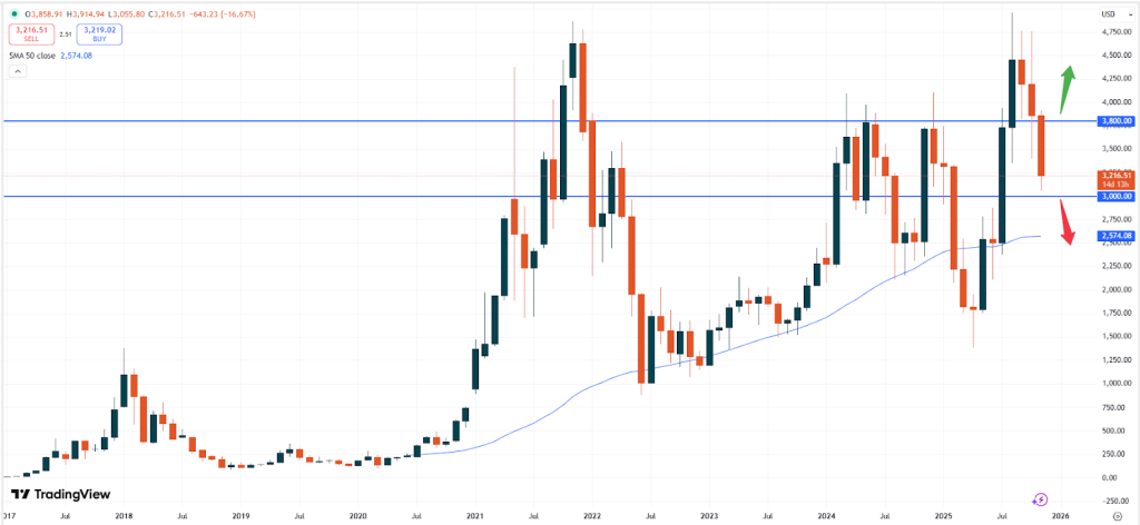 – ETH: Ethereum wird derzeit bei 3.216 USD gehandelt. Nachdem im August ein neues Allzeithoch erreicht wurde, war der Aufwärtstrend begrenzt, was zu einer erneuten Schwächung von ETH führte. Derzeit bewegt sich der Markt weiterhin in einer breiten Seitwärtszone.
