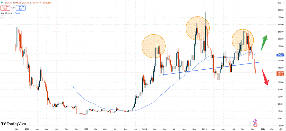 SOL – Solana wird derzeit bei 126,80 USD gehandelt. Der Druck in diesem Markt wird weiterhin durch das technische Kopf-Schulter-Muster dominiert.