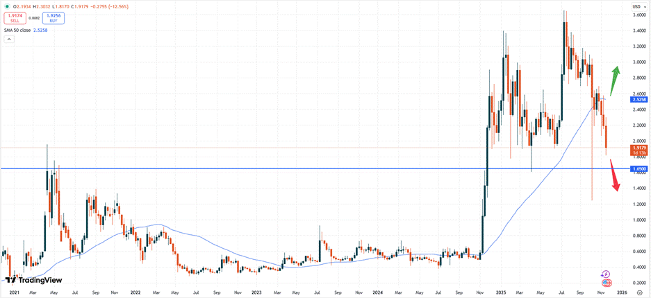 Da Ripple unterhalb der psychologischen Marke von 2,0000 USD handelt, könnte nun eine weitere Abwärtsdynamik einsetzen. Sollte der Kurs nun weiter fallen, könnte sich der Verkaufsdruck sogar noch verstärken. Wie der Chart zeigt, könnte die wichtige frühere Widerstandszone vom Mai 2022 dann bei 1,6500 USD eine Unterstützung bieten, wenn die Kurse weiter fallen.