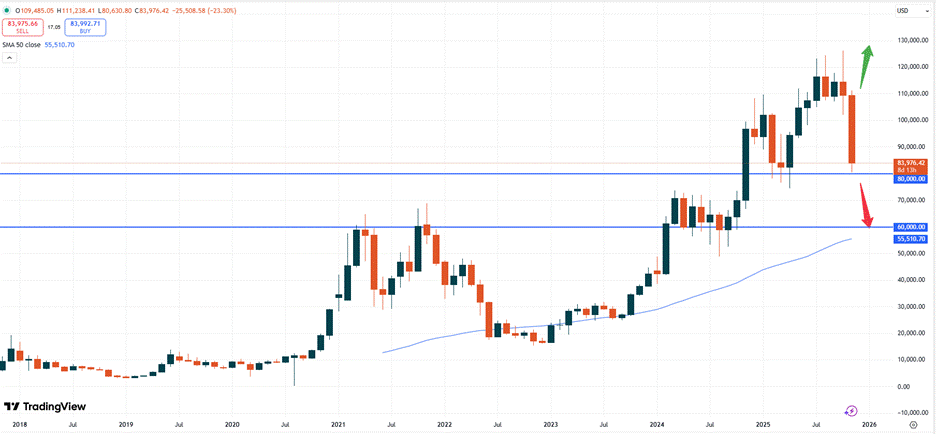 Der Bruch der wichtigen psychologischen Preisgrenze von 90.000 USD deutet nun darauf hin, dass sich die rückläufige Dynamik fortsetzen könnte. Die nächste Unterstützungszone liegt erst bei 80.000 USD. Dieses Niveau, das auch im März dieses Jahres als Unterstützung diente, wird den zukünftigen Trend bestimmen. Ein Anstieg aus dieser Zone könnte auf einen erneuten Test des Allzeithochs hindeuten.