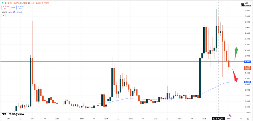– XRP: XRP wird derzeit bei 1,6098 USD gehandelt. Wie bereits erwähnt, befand sich Ripple gemäß dem bärischen Kerzenmuster vom Dezember in einem starken Abwärtstrend. Die nach unten gerichtete Kerze mit dem langen Docht nach oben deutet darauf hin, dass Schwierigkeiten bevorstehen könnten.