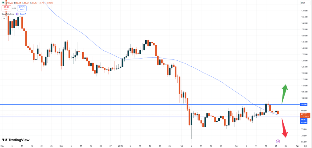 Zwar wäre ein Durchbruch über die Marke von 95,00 USD nötig, um neue Aufwärtsdynamik zu entfachen, doch scheint ein Bruch unter die Marke von 85,00 USD derzeit eher wahrscheinlich. Der allgemeine Trend bei Solana bleibt sehr schwach, und der Token testet derzeit die Zone des gleitenden 50-Tage-Durchschnitts, die kurzfristig als Orientierung dienen kann.