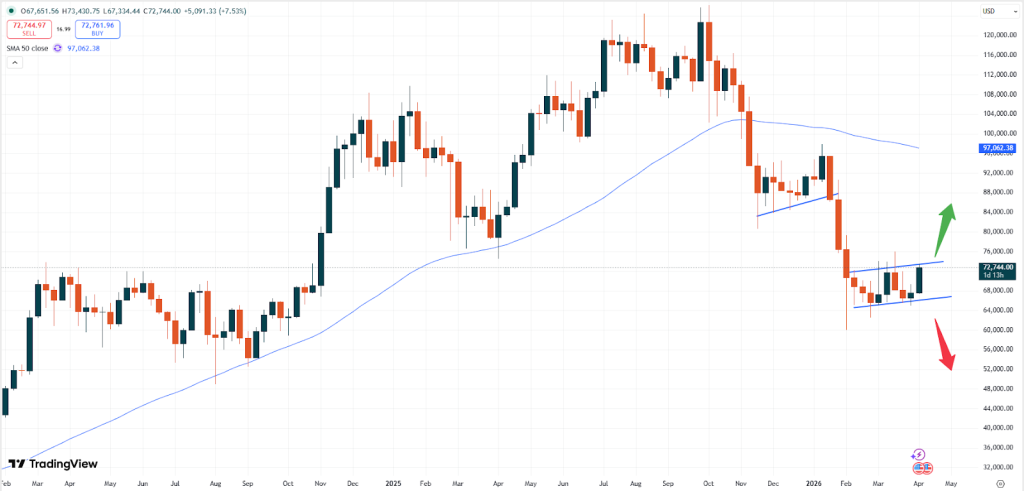 Sollte es zu einem Durchbruch über dieses Niveau kommen, könnte sich BTC in Richtung der 80.000-Dollar-Marke bewegen. In diesem Bereich befindet sich das nächste technische Widerstandsniveau. Ein Durchbruch unter das aktuelle Unterstützungsniveau würde zu einem weiteren Rückgang des Marktes führen.