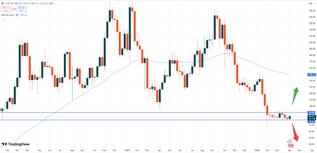 Sollte der Markt nicht in der Lage sein, diese Zone zu durchbrechen, könnte sich die Seitwärtsbewegung fortsetzen und Solana schließlich wieder nach unten drücken. Insbesondere ein Durchbrechen der 78,00-USD-Marke könnte dann den Verkaufsdruck erneut verstärken.