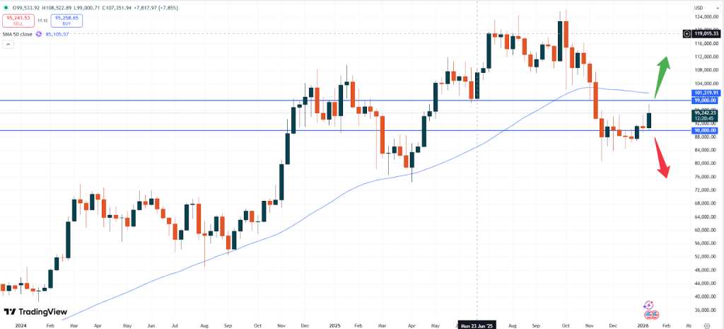 – BTC: El bitcoin se cotiza a 95.242 dólares estadounidenses. Dado que el mercado ha sido capaz de defender la zona de soporte técnico y psicológico de los 90.000 dólares estadounidenses, es posible que se observe un mayor impulso alcista. Como muestra el gráfico semanal que figura a continuación, el mercado no está lejos de la zona de la media móvil de 50. Esa zona podría ser el próximo objetivo si el bitcoin es capaz de volver a subir.