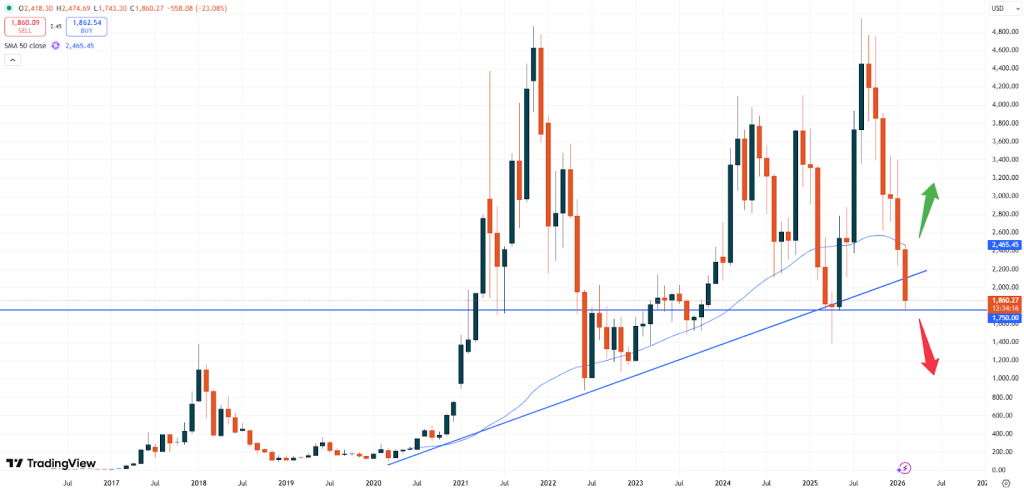 El mercado alcanzó un máximo en agosto de 2025, que solo superó ligeramente el máximo anterior de noviembre de 2021. Para retomar un impulso alcista sustancial, Ethereum debe superar primero el nivel medio móvil de 50, situado en torno a los 2.445 USD. Hasta que esto ocurra, el mercado podría seguir cayendo y volver a poner a prueba el nivel de los 1.500 USD.