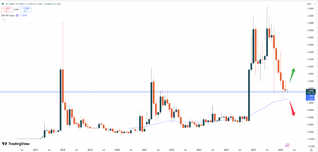 – XRP: El Ripple cotiza a 1,3425 dólares estadounidenses. A juzgar por el gráfico mensual que se muestra a continuación, parece que el precio seguirá bajando.