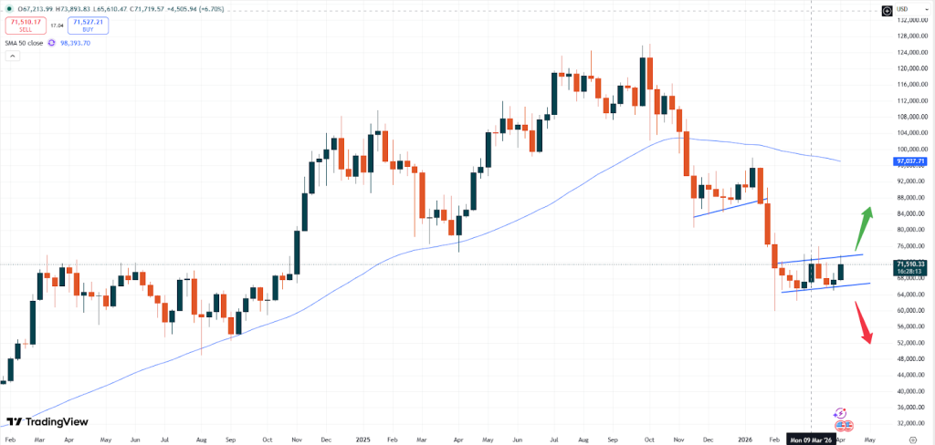 Si se produjera una ruptura al alza por encima de ese nivel, el BTC podría avanzar hacia los 80.000 dólares. En ese rango se encuentra el siguiente nivel de resistencia técnica. Una ruptura a la baja por debajo del nivel de soporte actual provocaría una caída adicional del mercado.