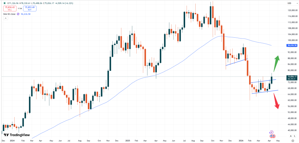 – BTC: El bitcoin cotiza a 75.836 dólares. El optimismo en cuanto al riesgo procedente del mercado de valores también contribuyó a la subida del bitcoin, y la moneda logró superar la zona de resistencia técnica situada por encima de los 74.000 dólares la semana pasada. Ahora, el impulso alcista parece tener vía libre y, si el optimismo continúa, esto podría provocar que el mercado siguiera subiendo.