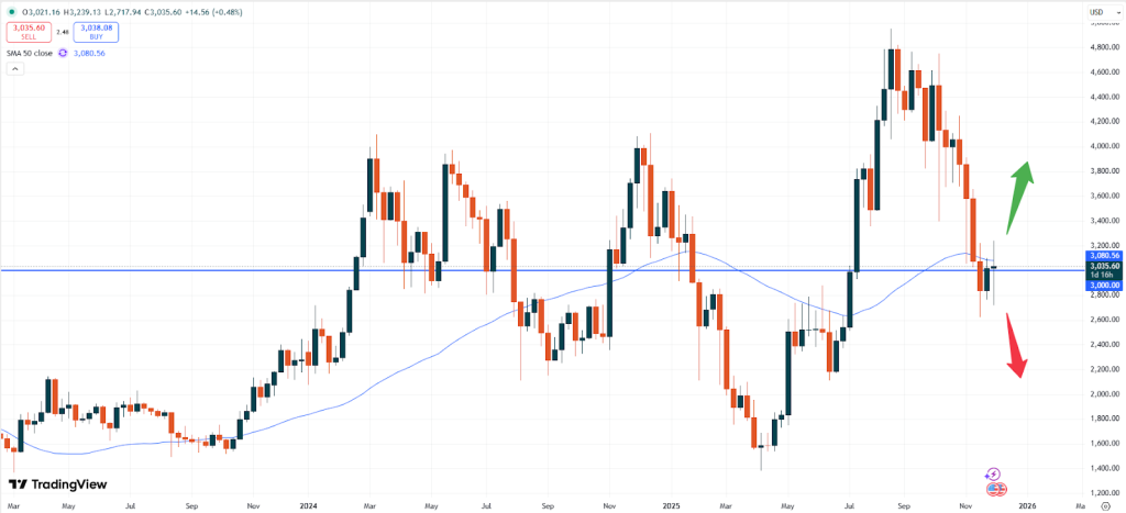 À moins que le niveau psychologique de 3.000 USD ne soit franchi, les traders devraient se concentrer sur la dynamique haussière vers le niveau de prix de 3.900 USD.