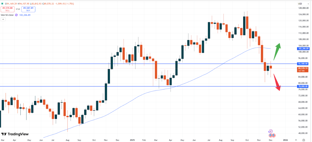 – BTC: Le Bitcoin se négocie à 89.570 USD. Malgré la récente correction des prix au cours des premiers jours de négociation de décembre, le marché a commencé à progresser. Si le niveau de soutien technique à 85.000 USD ne venait pas à être franchi, une dynamique haussière plus importante pourrait être observée. Un dollar plus faible pourrait également contribuer à une tendance à la hausse.