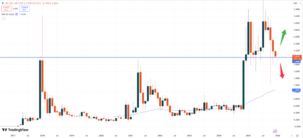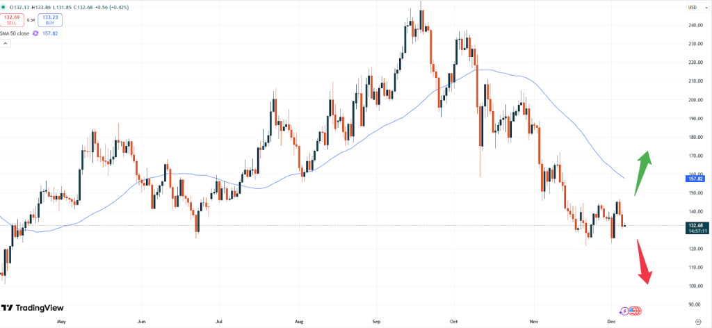 – SOL: Solana se négocie à 132,68 USD. Comme nous l’avons souligné à plusieurs reprises, le marché semble rester influencé par la configuration baissière en tête-épaules sur le graphique mensuel. Toutefois, à court terme, une dynamique haussière pourrait également se manifester.