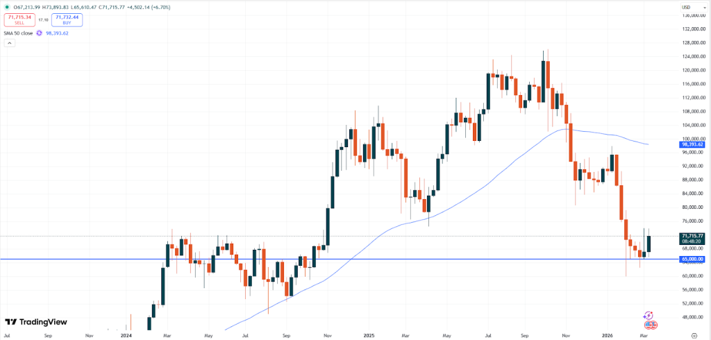 Il Bitcoin ha subito un calo di circa l’8,5% quando sabato è iniziata la guerra con l’Iran. Due settimane dopo, il BTC ha sovraperformato quasi tutte le altre attività, registrando una crescita di circa il 10%. Tali movimenti sono stati migliori di quelli dell’S&P 500 e dell’oro. Solo i prezzi del petrolio e il dollaro hanno registrato performance migliori in questo contesto.
