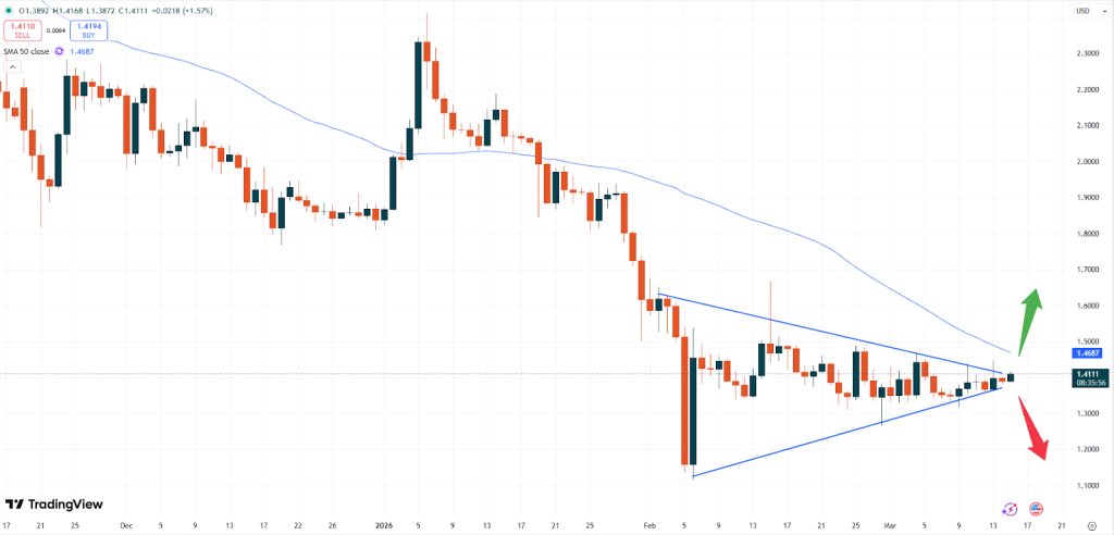 – XRP: Il prezzo di Ripple è pari a 1,4110 dollari. La recente rottura al rialzo della formazione a triangolo è ancora in corso e, per il momento, l’XRP sembra destinato a salire ulteriormente.