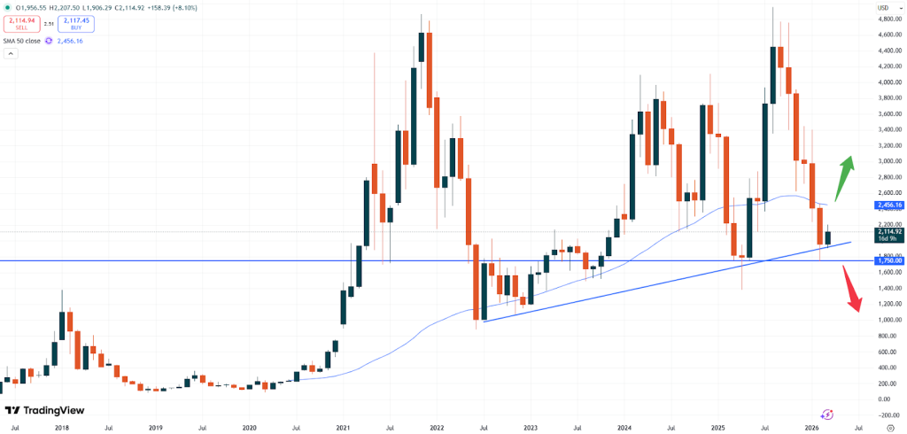 – ETH: Ethereum viene scambiato a 2.114 dollari. Inoltre, finora in questo mese l’ETH continua a essere scambiato a livelli elevati. Il prezzo sembra difendere l’importante zona di supporto a 1.750 dollari, fondamentale per l’andamento futuro del mercato. Una rottura di questa zona potrebbe ancora determinare un calo del prezzo, mentre una rottura della media mobile a 50 giorni a 2.456 dollari potrebbe innescare un nuovo slancio al rialzo.