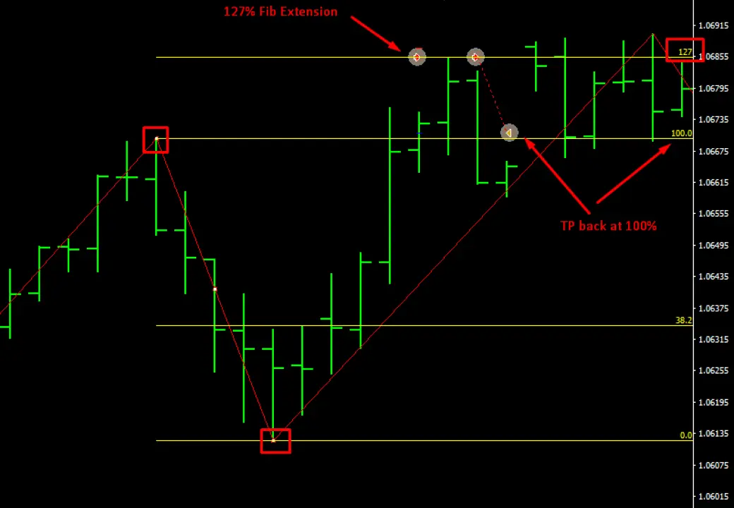 Si è verificato durante una confluenza di Fibonacci (dove più di un tipo di Fibonacci si allinea). Possiamo vedere che il ritracciamento di Fibonacci al 61.8% si allinea bene con l'espansione di Fibonacci al 78.6% all'interno di un intervallo di tolleranza del 5%. Entriamo quindi in un trade con il nostro take-profit impostato nuovamente al ritracciamento di Fibonacci al 38.2%.